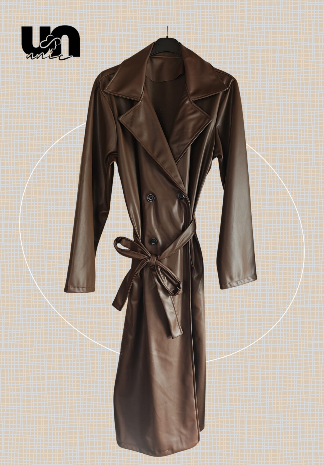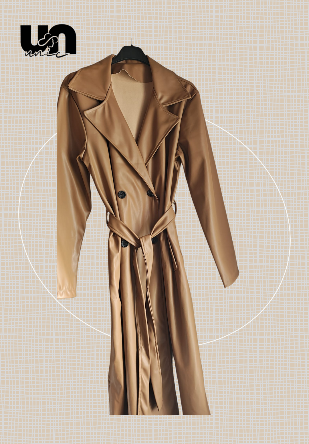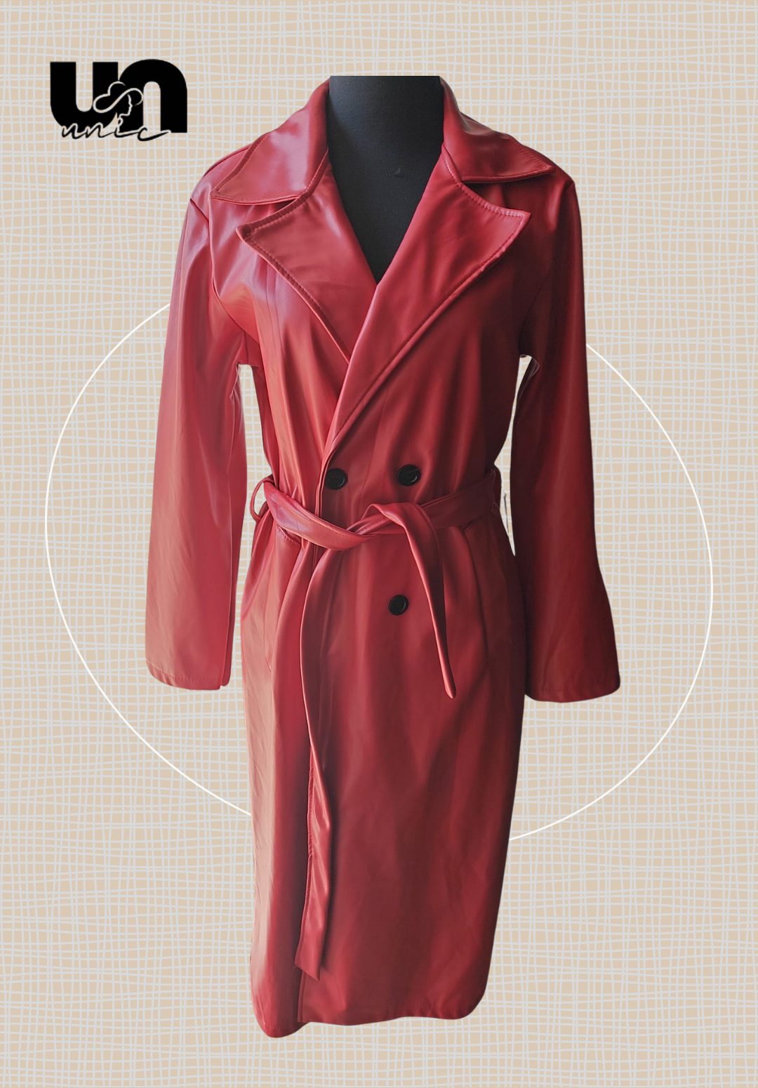 Confeccionado en polipiel brillante en un vibrante color rojo carmín o coral, es una pieza de declaración que no pasará desapercibida. El diseño imita la clásica gabardina con cuello de solapas amplias y un elegante cierre frontal cruzado con botones negros contrastantes. Incluye un cinturón a juego que permite ajustar la cintura para conseguir una silueta entallada y femenina.