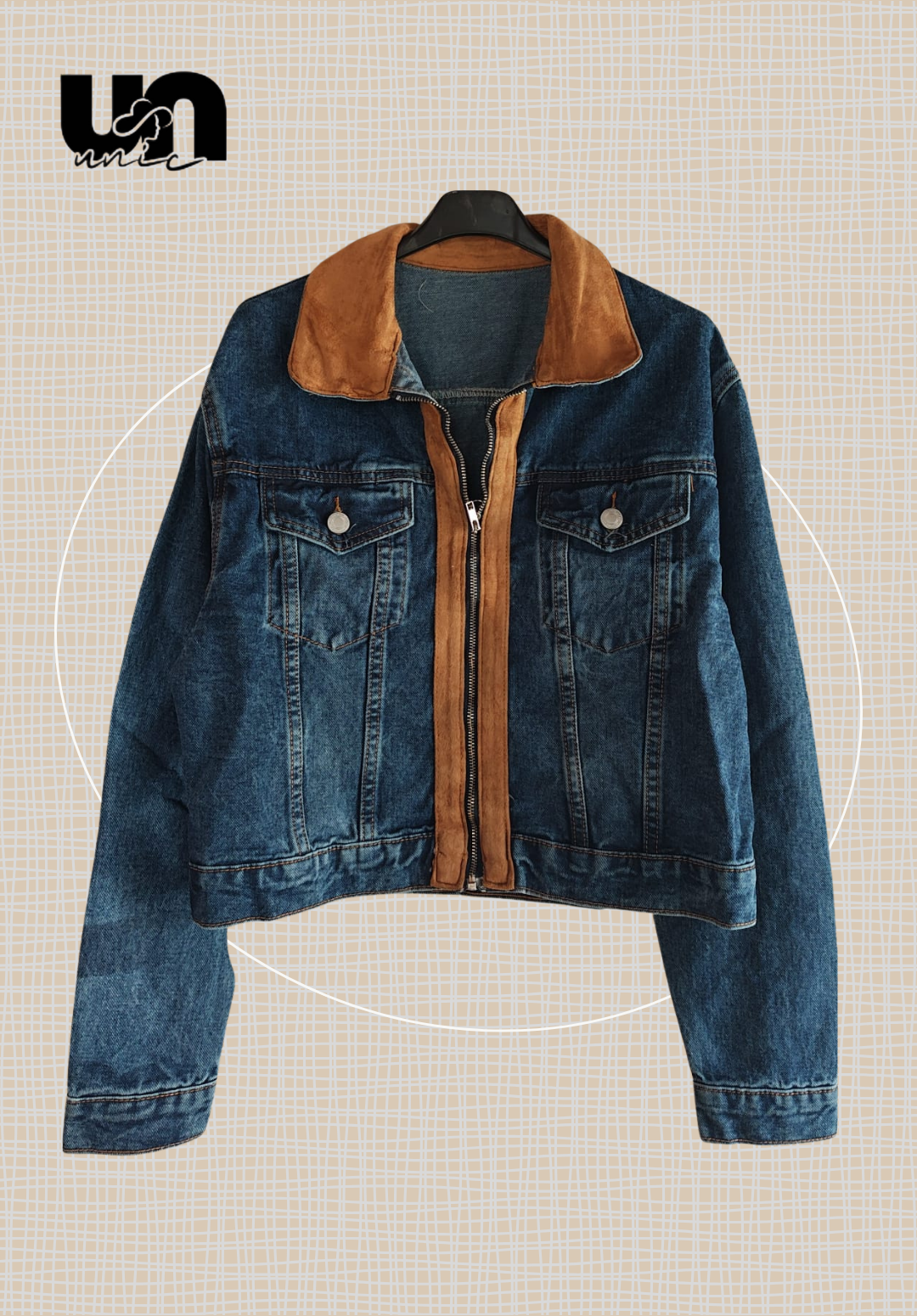 La clave de su distinción son los adornos en tejido efecto piel de color camel. Este material realza el cuello, otorgándole una textura aterciopelada de contraste, y recorre la cremallera frontal, fusionando el estilo cowboy con el biker. Combina la funcionalidad del tejido vaquero con detalles clásicos como los bolsillos en el pecho con solapa y botón. Es la prenda perfecta para inyectar carácter y audacia a cualquier conjunto, manteniendo la versatilidad del denim.