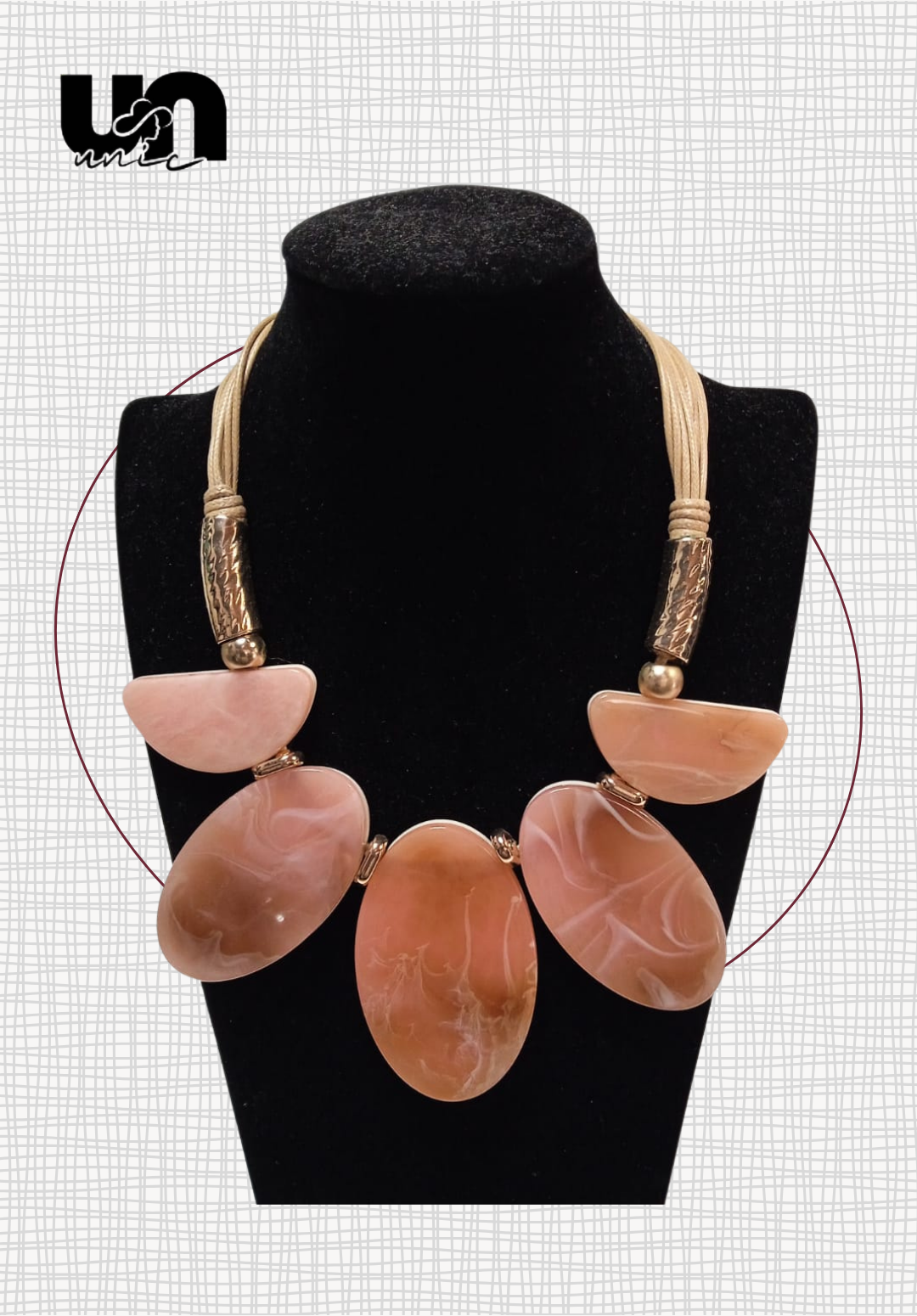 Las piezas centrales presentan un hermoso efecto de resina jaspeada en tonos que varían del rosa palo al ámbar cálido o terracota. Los dos eslabones exteriores, de color rosa más uniforme, flanquean el diseño. El collar está sostenido por múltiples cuerdas de color beige o arena que le dan una base orgánica y cómoda. Es el accesorio perfecto para realzar looks neutros y sentir la conexión con la naturaleza a través de un diseño sofisticado y moderno.