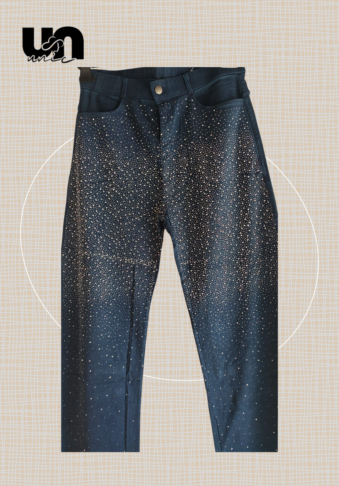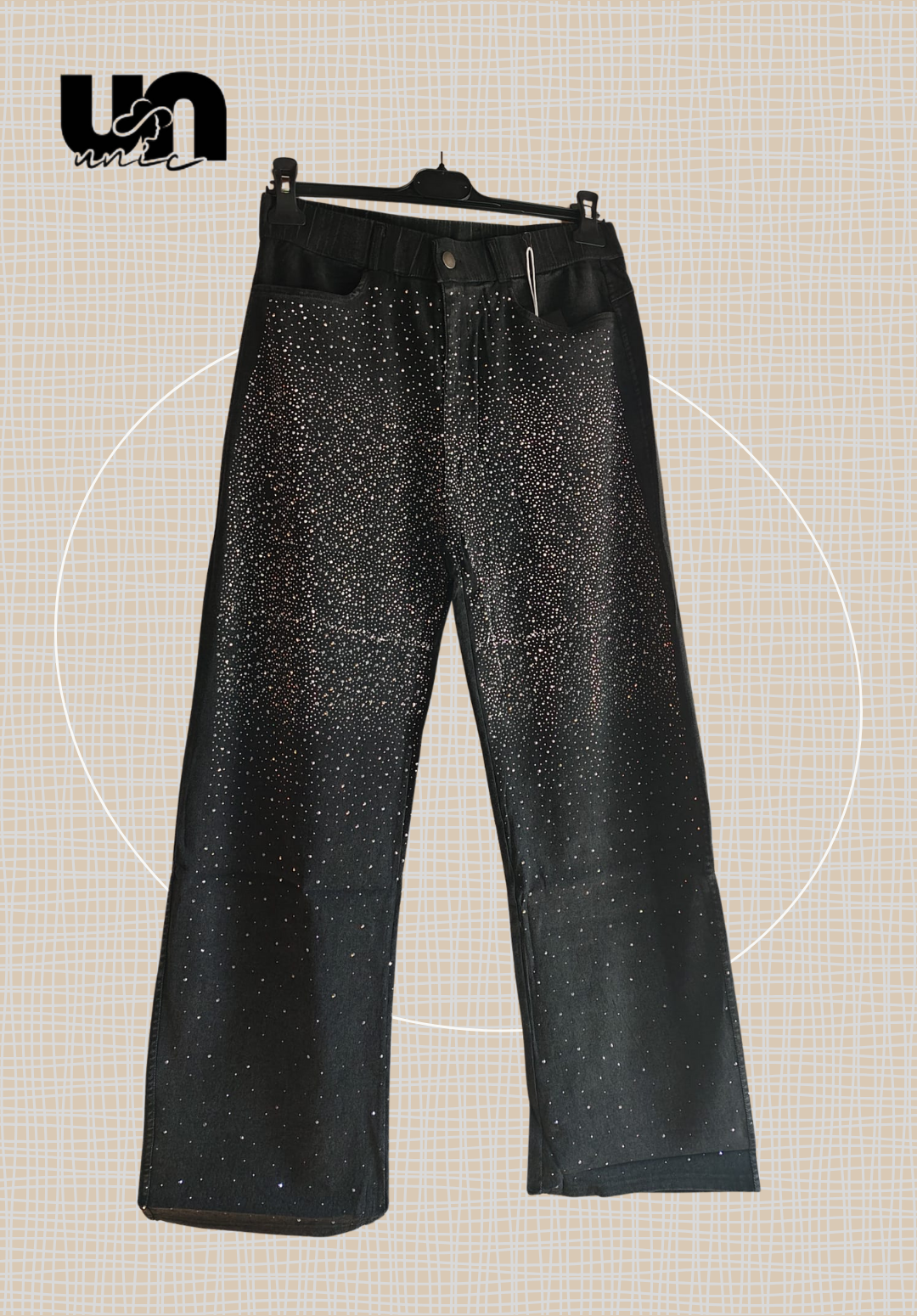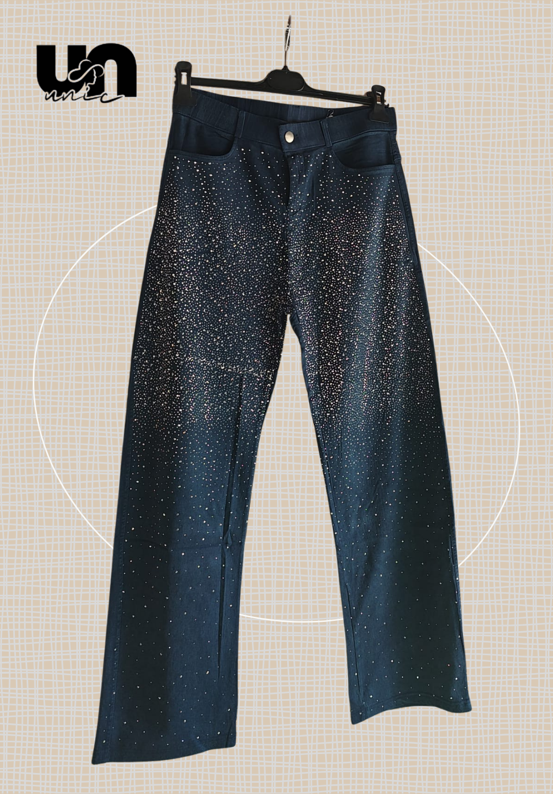 Añade un toque de luz a tu estilo con este pantalón vaquero, una prenda tan cómoda como deslumbrante. Confeccionado con un tejido denim suave, este pantalón destaca por su diseño único: las perneras están adornadas con pequeños brillos, creando un efecto espectacular.