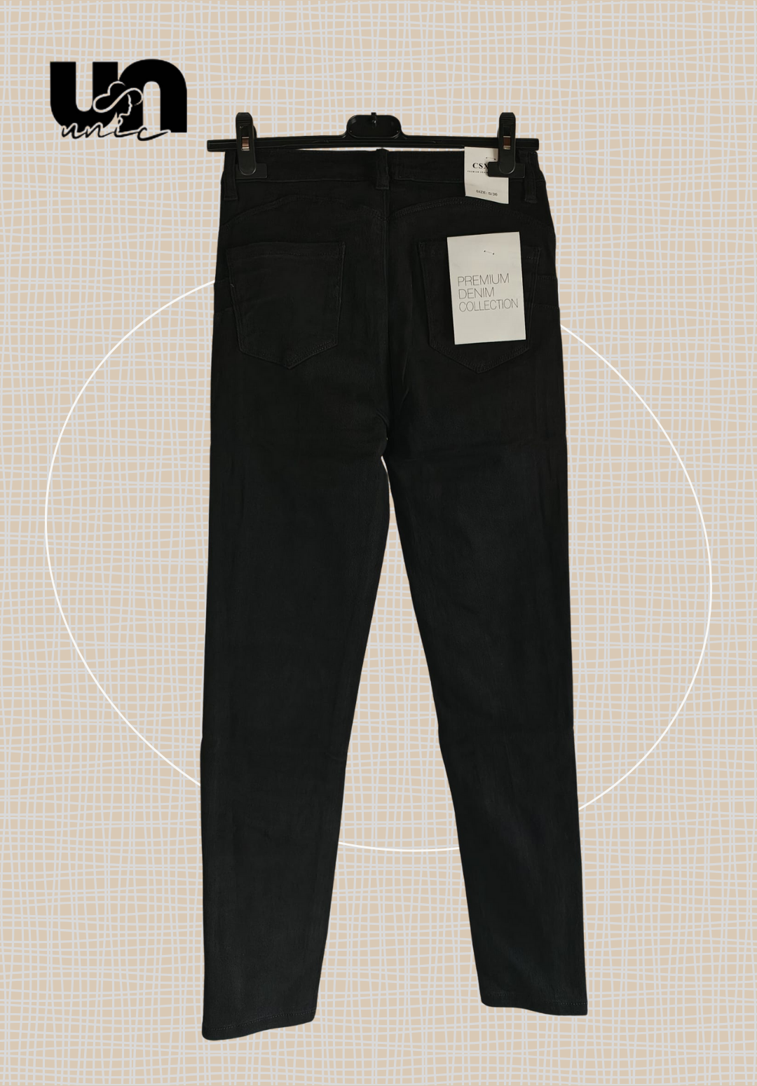 Confeccionados en un denim negro intenso (no desgastado), estos pantalones presentan un corte ajustado (slim o skinny) que moldea la figura. Son de tiro alto y su color sólido te permite combinarlos para looks de día, de oficina o de noche. Cuentan con el clásico diseño de cinco bolsillos y un parche en la cintura trasera.