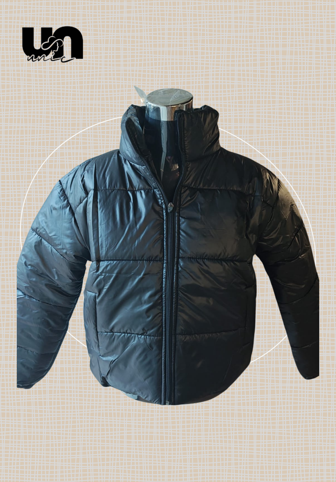 Esta cazadora de corte oversize, es tu aliada perfecta para el frío. Confeccionada en un tejido ligero y con un acabado negro liso brillante, su diseño acolchado con costuras horizontales distribuye el calor de forma eficiente. Presenta un cuello alto que protege del viento y un cierre de cremallera frontal.