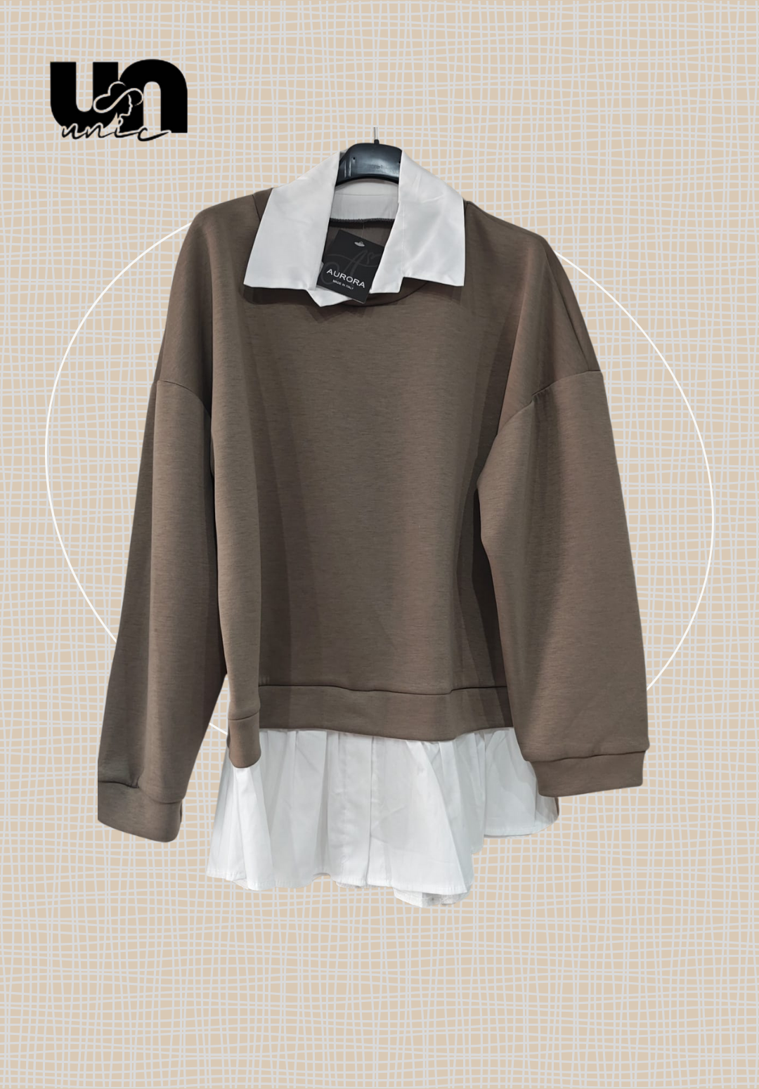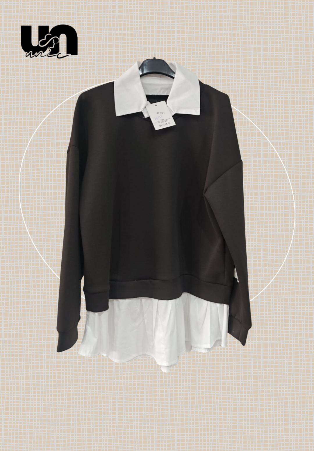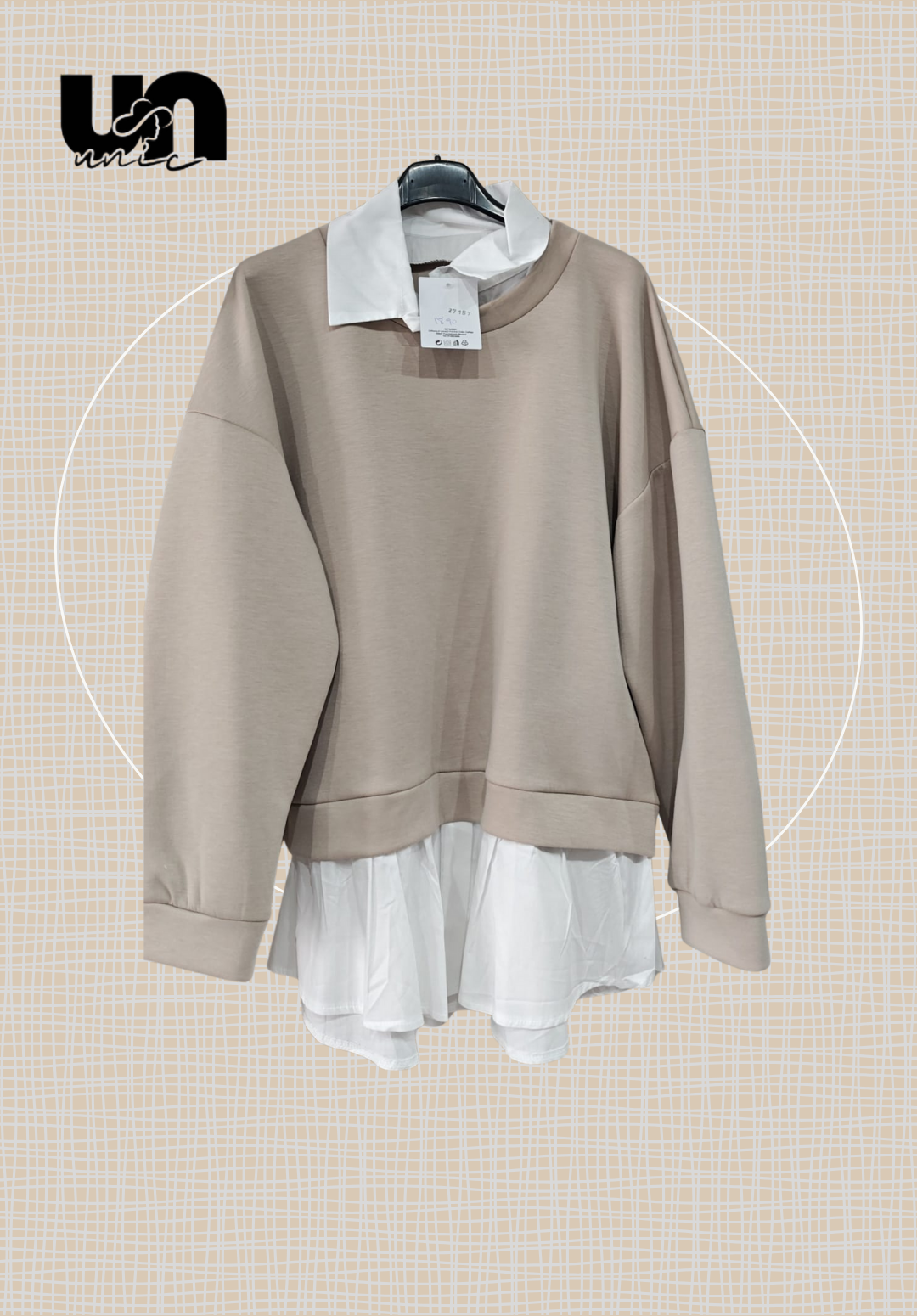 Nuestra Sudadera UNIC ‘Efecto 2 en 1’ te ofrece la comodidad de una sudadera con el estilo pulido de una camisa, todo en una sola pieza. El diseño presenta una sudadera de corte oversize en un versátil tono neutro que proporciona una silueta relajada, perfecta para el día a día.